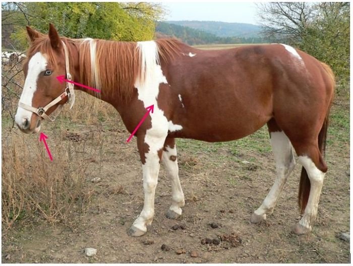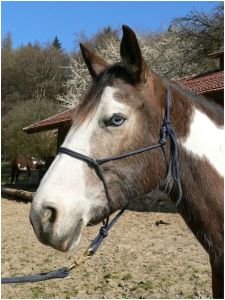 Na následující fotografii klisny tobiano si všimněte „zubatějších" okrajů bílé oblasti na plecích a modrého oka. Nelze vyloučit kombinaci tobiana s frame overem nebo sabinem. Vzoru sabino by nasvědčovala depigmentace na bradě. Genetický test nebyl zatím proveden.
