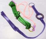 Chambon je ve skutečnosti jednoduché zařízení. Mohli byste si ho udělat sami, pokud by nebylo dražší nakoupit jednotlivé komponenty, kožený řemen, kroužky a lanko, než si pořídit v obchodě již hotový produkt. Potřebujete obřišník pro upevnění hlavního řemene (modrý), pokud nemáte lonžovací obřišník, použijte sedlo a jeho podbřišník. Dále je tu krátký řemínek (zelený) připnutý přes nátylník uzdečky, který je opravdu potřeba. Pak tu jsou kroužky (žluté) na obou koncích tohoto řemínku, skrze které prokluzuje lanko (červené) připnuté do kroužků udidla.