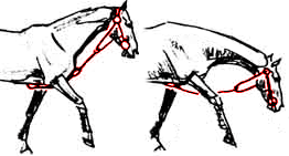 Stejně jako v případě, když kůň nese hlavu nahoře, nepomůže jeho držení těla tah otěží dolů, je přirozenou instinktivní reakcí koně bojovat s tahem průvleček, které ho táhnou za hubu. Úkolem otěží není umístit hlavu koně dolů, ale spíš uvolnit dolní čelist a jazyk, takže se kůň do otěží natáhne. Pouze on sám, nikdo jiný mu nesníží hlavu, ani jezdec, ani nějaká otěž!