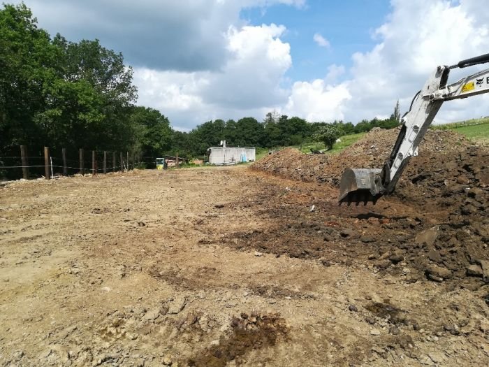 Protože spokojenost a pohodlí koní je u mě na prvním místě, rozhodla jsem se pořádně zainvestovat a vybudovat opravdu kvalitní paddock bez bláta, kde budou mít koně hlavní stanoviště. Tím se pošetří podstatně menší zátěží i louka. V květnu, kdy už se koně pásli a nepotřebovali přístup na plac k balíkům sena, jsem zavolala známému s velkým traktorem, aby vše vyhrnul a odvozil. Pak jsme se pustili do budování.