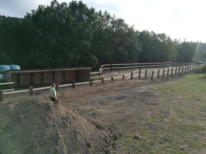 Když jsme si koně dovezli domů, nebyl povrch výběhu nijak upraven. Postupně, s dešti a zátěží na ploše, se začalo objevovat bahno, samozřejmě hlavně u přístřešku, kde se koně nejvíce zdržovali – navazující pastvina na tom tak zle nebyla. V ohradě bylo naštěstí plno stromů, jenže je zabil kůrovec a my je museli pokácet.