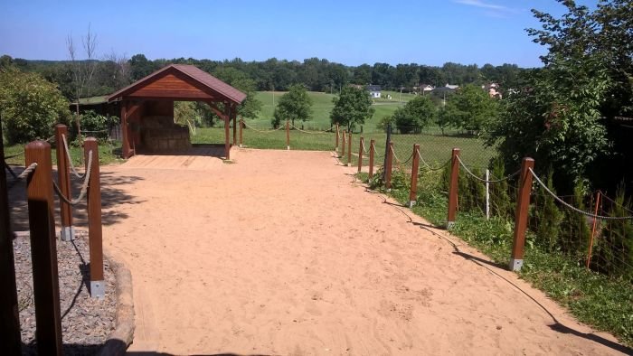 Potom se na celou plochu navozil makadam a štěrk 0,32 (cca 200 tun) a rozhrnul, zhutnil plus na vrch přišel lomový prach (cca 40 tun). Celé se to znovu zhutnilo vibrační deskou. Hlavní část jsme tedy měli hotovou – a funguje, jak se ukázalo, skvěle!