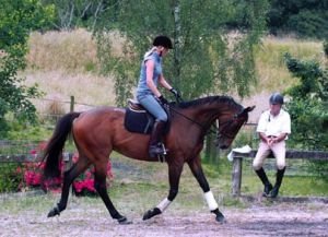 "Pokus se ho narovnat. Tak jak se vybouluje doprava, tak nalevo padá dovnitř. Musíš si dobře uvědomit stopu, po které jedeš, a snažit se ji opravdu sledovat bez toho, aby uhýbal od tvojí holeně." "Teď zkus ustupování na holeň do středu jízdárny. Ustupuj od pravé holeně doleva a drž ho rovného, potom změň směr a to samé cvičení z druhé ruky. Záleží, jak moc je citlivý na holeň, ale nic se nestane, když občas dáš holeň od koně a necháš ji dopadnout zpět na jeho bok. Musíš posoudit, jak silně to můžeš udělat – samozřejmě chceme reakci bez vyhazování!"