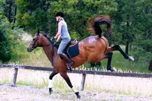 "Fajn, požádej ho znova – aaah, chtěl jsem abys ťukla, ne zmáčkla. Nenech ho strčit hlavu mezi kolena, jinak tě sundá. Takhle. Zpátky do klusu – bude to tvoje rozhodnutí. Pobídni teď zpátky do cvalu, uvidíme, jestli to půjde. Udržuj kontakt a tvoje celé tělo mu bude říkat "cval". To je na dostihových koních fascinující, neumí cválat, ale umí jít tryskem."