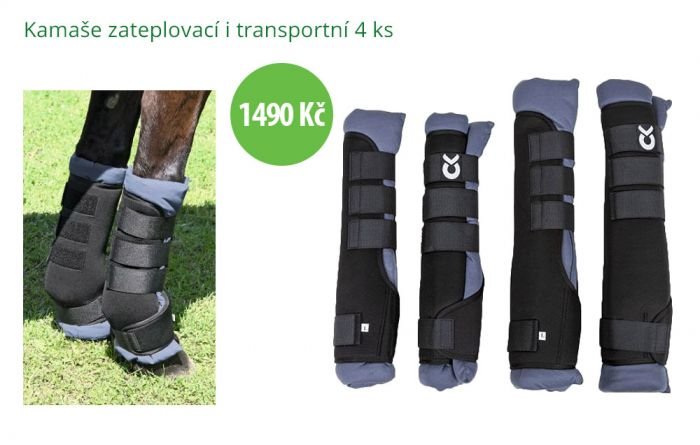 – Novinka v nabídce, sada kamaší určených jako stájové termokamaše, ale také jako kamaše transportní. Kamaše mají vyjímatelnou vnitřní termovložku, která se dá vyndat a vyprat. Termokamaše se zapínají na suché zipy, z nichž jeden jde pod spěnkovým kloubkem, kterému tak poskytuje oporu a ochranu. Balení obsahuje 4 kusy kamaší. Cena: 1490 Kč