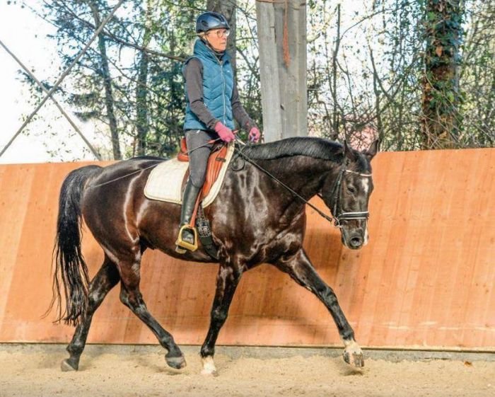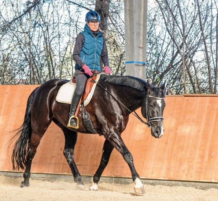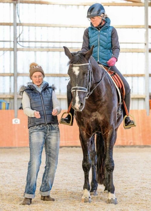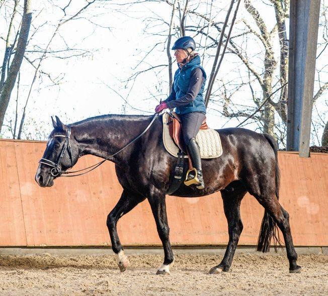 Na dlouhé otěži je valach spokojený. Silvia List-Reichart sedí hluboko a pružně s jemnou rukou, za což jí trenérka pochválí. Přesto v kroku a v klusu nejsou zadní nohy dostatečně aktivní a courá špičkami kopyt v písku. „Je to hezké a klidné, ale nemá to žádný výcvikový efekt.“