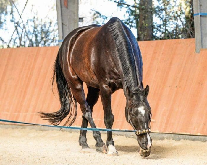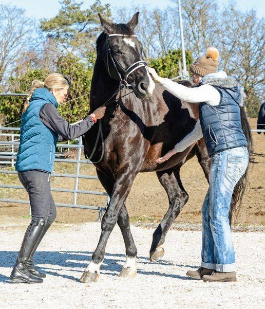 Trenérka Sabine Ellinger nejprve provádí „kontrolu“ a Saviho vyšetřuje. Drezurní jezdkyně vede výcvikové a rehabilitační centrum a věnuje se zde mnoha koním se zdravotními problémy. „Nejsem sice fyzioterapeutka nebo osteopat, ale umím zkontrolovat body, které mohou být zdrojem potíží,“ vysvětluje Ellinger. Na páteři není Savi citlivý, ale při lehkém tlaku na krku reaguje podrážděně a uhýbá. „Má ztuhlý ramenní zvedač hlavy. Tenhle sval je antagonista pilovitého svalu hrudního, který stabilizuje horní linii. Pokud nepracuje správně, nemůže Savi používat ani pilovitý sval,“ vysvětluje Ellinger. „Nemůže zvednout hrudní koš,“ dodává. Sedlo je pro Saviho čerstvě napasované a vypadá, že mu sedí dobře. Valach nejeví známky tělesného problému, je v dobré kondici a má korektní exteriér, který ho nijak neomezuje. Jde se na další kolo – na lonž!