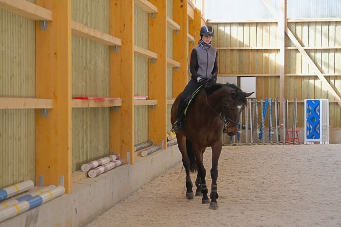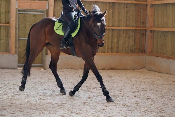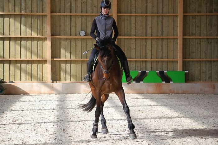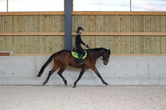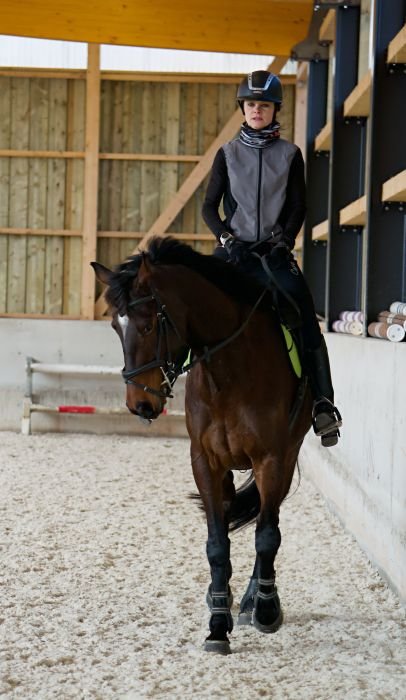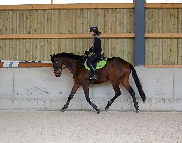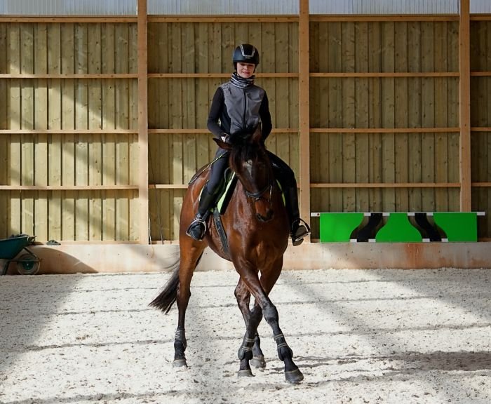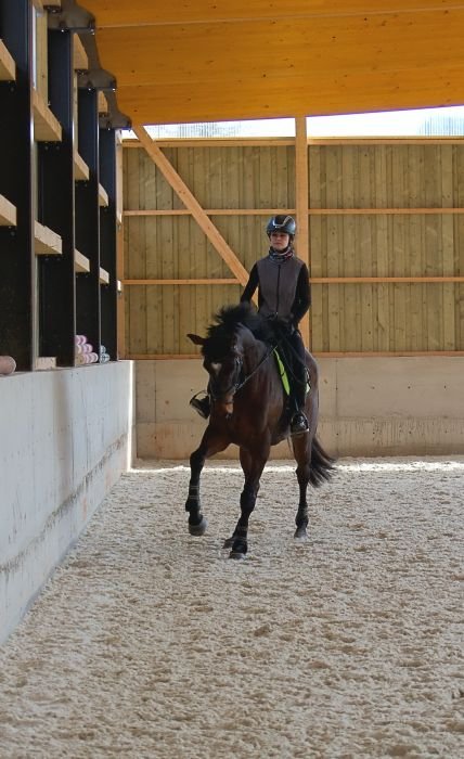 Jako ukázku jsem si pro vás připravila několik fotek z tréninku. Záměrně jsem si vybrala koně a jezdkyni, kteří se primárně nevěnují drezuře. A to právě proto, abych vám ukázala, že tato cvičení můžete bez obav zařadit do tréninku jakéhokoli koně, od rekreačních až po koně do parkuru, military nebo i vytrvalosti. Jak už jsem zmínila dříve, nejde nám totiž o perfektní techniku, ale o protažení těla a rozhýbání kloubů a svalů.