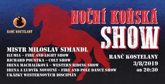 Žádný sport? Žádné vzdělávání? Chcete si koně užít v roli diváků? Pak musíte dorazit v sobotu 3. srpna na Ranch Kostelany a zhlédnout Noční koňskou show 2019. V prostorách Ranče Kostelany vystoupí se svojí koňskou show Miloslav Simandl, čekají na vás i ukázky westernových disciplín a samozřejmě i další účinkující. Program je tedy připraven pro celou rodinu!
