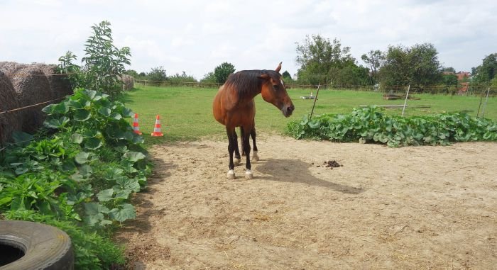 Vše stále zasypáváte hnojem a pokud je možnost, klidně i pískem a hlínou. Prostě cokoli, co máte při úklidu výběhů „navíc“ a šlo by to na hnojiště. I zmulčovanou trávu, pokud ji dobře s kobyláky a slámou promísíte (aby v silné vrstvě nehnila). Vytváříte si vlastně celý podzim a zimu zvýšený záhon (a samozřejmě nadzvedáváte spodní pásku ohradníku). Na jaře v něm začne rašit ze zbytků sena travička, ptáci do něj zavlečou tisíce semínek kde čeho – a najednou se vám začnou pod páskami zvedat dokonalé zelené mantinely. Jakmile jsou stálou součástí výběhu, koně si jich opravdu přestávají všímat. Max. sem tam ukousnou nějakou vyšší travičku, ale většinu nechají na pokoji až natolik, že musíte popadnout křoviňák, chcete-li udržet porost nízký. Občas tedy kopečky oholte, občas přihoďte nějaký ten čerstvý kobylák… „ovoní“ záhon natolik, že si k němu koně moc často nečichnou – pastviny a seno je lákají určitě víc. Po roce, až máte dobře obrostlo, už bez obav nenápadně dosejte například plazivé požíračky obrovského kvanta živin – dýně nebo cukety. Koně si rostlin vzejitých ze semínek mezi ostatním „hnojným“ porostem nevšímají, netrpí-li opravdu příšernou nudou. Moje stádo osázení kolem výběhů ignoruje natolik, že jsem po létech došla již tak daleko, že seju i přímo mezi ně – dovnitř do ohrad základních výběhů, ne jen zvenku nebo pod pásky: