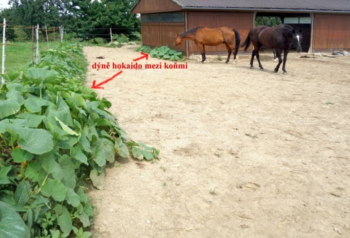 Předěl mezi jízdárnou a základním výběhem mohou dýně a cukety celé léto zdobit a zároveň přinášet praktický užitek na jídelníčku rodiny. Spodní řadu pásek nechte bez proudu. Dýně ji postupně bujně zarostou. Dlouhé šlahouny jemně stáčejte podél záhonu, ať vám je koně nepošlapou. Klidně je můžete i stříhat, máte-li plodů dost a trifidi se rozrůstají příliš explozivně. 🙂