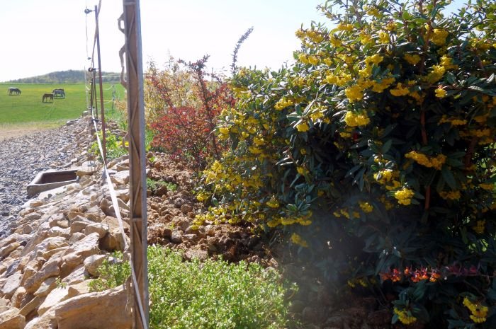 Dřišťál v kompostovaném koňském hnoji – užitečný keř pro ptactvo, kterému poskytuje nejen potravu, ale výborné skrýše. Sice je jedovatý, ale koně si ho absolutně nevšímají, trnité větvičky, přesáhnou-li mi někdy dovnitř do ohrad, zůstávají zcela nedotčeny. Dokonce ani jedlého muchovníku, ze kterého mám živý plot hned vedle, si stádo vůbec nevšímá. A mohu zodpovědně prohlásit, že v kobylákovém záhonu se mu oproti normální půdě daří asi tak o tisíc procent lépe! 🙂