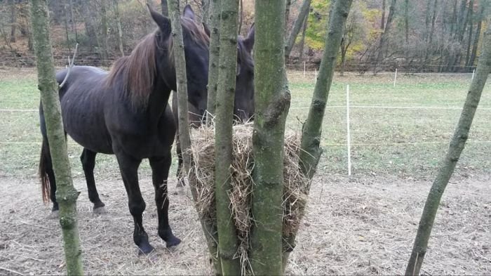 Vyhovuje-li stáji rozvážet vícekrát denně odměřené dávky sena a podněcovat kupičkováním nebo větším počtem krmelců pohyb, není to známkou horší péče! Často právě naopak… Naučte se rozlišovat koně hladové (dlouhodobě prázdný krmelec na seno a nikde ani tráva ani krmná sláma) a koně motivované managementem stáje k popocházení za roztroušenou potravou (porůznu na zemi roznošené seno a sláma, vícero krmných míst po celém pozemku).