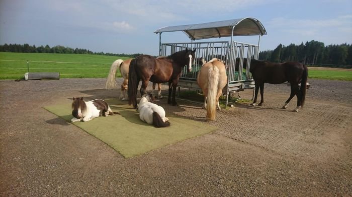Pokud je ohrada jenom hliněným pláckem, stádo pouze dvojicí starších vyklidněných již koníků (jak často v domácích ustájeních vídáme), jak jinak se ubránit nečinnosti a zoufalé nudě, než tím jediným, co plácek nabízí – senem? A tak se stojí a žere a žere… Obezita má zelenou.