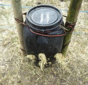 Barely umístěné porůznu po výběhu. Zde dávejte dobrý pozor, aby seno dobře klouzalo dolů k otvorům a koně se skutečně nažrali! →