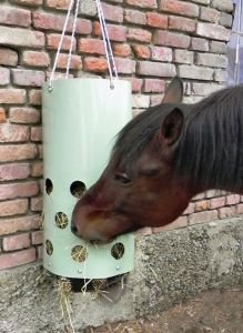 Dvě sítě v sobě (poníci jsou na dietě) a pneumatika sloužící coby podstavec a držák sítě v jednom – uvnitř gumy je umístěné očko, ke kterému se síť připne karabinou.