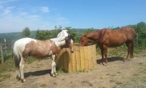 Krmné kruhy porůznu po výběhu – domácí kovová konstrukce s dřevěnými lištami. →