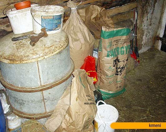 Po krátkém uvítání a chvilce běžného povídání jsem k večeru zavedl Sagu s hříbětem do boxu a se švagrem jsme pokračovali v přípravě krmení. Balíky sena mohu zhodnotit jako výborné kvality, dostal jsem i jméno dodavatele. Na zimu je nasmlouváno cca 100 velkých kulatých balíků. Koním jsme roznesl do žlabů vodu (nemají napáječky, ale klasické kamenné žlaby), připravená podestýlka byla v dostatečném množství, boxy vypucované, žádný čpavkový smrad a stáj vzdušná a suchá, bez průvanu. Dále jsme pokračovali v rozvozu sena a granulí (Běstovice standard, zásoba asi 20 pytlů). Poté byli koně v puštěni do boxů.