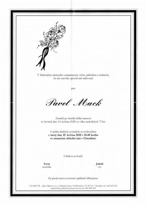 Rozloučení s panem Pavlem Mackem proběhne v úterý 19. května 2020 v 10.00 hod. ve smuteční obřadní síni v Chrudimi.