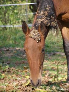 Pokud si lopuch v pastvinách zavčas neposečete, začnou vám z výběhů chodit naproti koně nazdobení zajímavými účesy nevšedních tvarů a velikostí: občas si pořídí styl Jednorožec, občas nedbale zacuchaný vzhled Přírodní ležérnost, sem tam přepečlivý drdol Ježčí symfonie… A zásadně namísto vlásenek, sponek a vlasových skřipců používají čumbrky – hodně (jakože opravdu HODNĚ) čumbrků! No a to pak čubrníte!! Až se vám z nosu kouří, jak se to snažíte prodýchat a neomdlít… Pokud od září až do hluboké zimy číhají kolem vašich vyjížďkových tras celé houštiny zákeřných vetřelců, připravených nachytat se zahnutými háčky na vše, co se kolem nich ochomýtne, nemáte potom obří léčivku, ať si je jakkoli užitečná, zrovna v lásce… Třeba u nás se málokterá podzimní vyjížďka obejde bez této ozdoby dovlečené v ocasech koní. A to si mohu od srdce gratulovat, že nemáme lopuch v pastvinách!