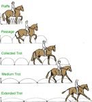 Už jsem se v minulých dílech zmiňovala o tom, jak došlapují zadní končetiny v různých ruších klusu, od prodlouženého až po piafu přes shromážděný klus a pasáž. Tomu se říká souvislá řada ruchů v klusu. Vše to jsou diagonální pohyby s delšími nebo kratšími kroky a fází vznosu. Samozřejmě podle toho, jak interpretujete pojem „fáze vznosu". Všechny chody, od prodlouženého klusu až po piafu, lze provádět v nekonečné podobě od jednoho extrému po druhý. Znám mnoho jezdců, dokonce i soutěžících na úrovni GP, kteří netrénují plynulé přecházení mezi ruchy shromažďováním a prodlužováním mezi výše uvedenými extrémy. Trénují klus, začínají pracovním, pak jezdí více dopředu, zatímco někdo na zemi říká, že je to střední klus. Pak jezdí ve středním klusu, dokud někdo neřekne, že je to dobré a že to stačilo. Pak jezdí ve shromážděném klusu, přičemž zadržují energii koně a což končí tím, že ho prostě zkracují a oni se bojí, že mu zničí chody. Takže opět jdou trénovat střední klus.