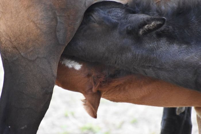 Kobyla zpočátku koukala dost blbě, ale jak z malé cítila svůj pach a pach druhého (svého) hříběte, tak vyloženě zlá na sirotka nebyla. Ale hlídala si hlavně svoji narozenou kobylku. Pomalu jsme je vedli ke stáji… Tam jsem si ji vzala na dvůr, abych měla všechny tři pěkně na očích. Po chvilce napětí se zdálo být vše v pořádku, obě malé spokojeně pily. Přišlo nám to jako neskutečné štěstí v neštěstí, takový velký zázrak, kterému jsem ani uvěřit nemohla. Samozřejmě jsme klisnu s oběma hříbaty pečlivě sledovali, přece jen jsme si nebyli jisti, jestli se kobyle v hlavě postupně nevylíhne nějaká pochybnost a svůj velký úkol si nerozmyslí. Ale všechno vypadalo růžově, u vemínka se obsluhovala bez potíží obě hříbata a my si tedy pomaličku oddychovali…