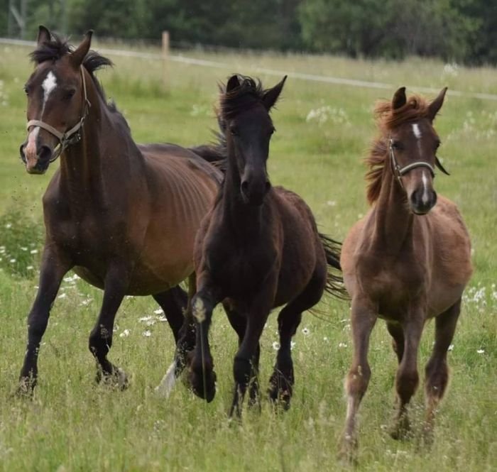 V 9 měsících jsem obě hříbata raději odstavila, ať se kobyla dá do pořádku po náročné laktaci. Ale po návratu do stáda (když se klisna zasušila a hříbata již k vemenu nepustila) se opět napojily nitky dřívějšího vztahu a všechny tři holky se nanovo daly dohromady, i bez plného vemínka maminky. 🙂