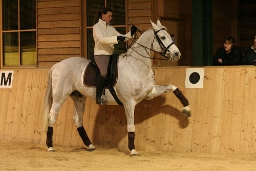 Ve cvalu se chtěli věnovat přeskokům, které dvojici činily problémy. Začali cvalem na velkém kruhu, pak kontracval, přičemž PK vyžadoval při kontracvalu ohnutí k vnitřní ruce. Po vytažení a přestávce v zastavení prováděla dvojice na kruhu přeskoky z normálního cvalu do kontracvalu. Tento postup je dobrý pro koně, který se přeskoky teprve učí; musí však dobře zvládat kontracval. Pak se s ním cválá na kruhu ve správném cvalu, ale ve velmi mírném kontrasestavení (krk téměř rovný), to už koni říká, že bude kontracval. Po pobídce do přeskoku tak přeskočí buď správně, nebo nejdřív zádí a opozdí předek, ne naopak. To je menší chyba, než kdyby přeskočil jen předkem.