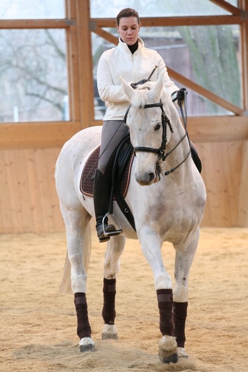 Po krátké přestávce v zastavení Isabella zkrátila otěže, uvolnila hubu, nechala koně vyklenout týl, rozešla se a upravila tempo kroku (trochu zasedla a přizvedla ruce, aby koně zpomalila). Pak pokračovali v práci na dvou stopách. Dovnitř plec na stěně > malý kruh > dovnitř plec na stěně > na druhou ruku to stejné. Poté nechat koně vytáhnout krk. Otěže zkrátit, koně ohnout a na stěně travers > z rohu obloukem změnit směr a překrok. Nechat koně vytáhnout > zkrátit > na druhé stěně travers > obloukem změnit směr a překrok. Vytáhnout, pauza v zastavení. Zkrátit otěže, hubu uvolnit stihlem, týl pákou, pokud kůň neposlechne, je třeba mu ohnout krk a tím ho uvolnit. Pak jezdili v pracovním klusu: dovnitř plec > velký půlkruh v živém lehkém klusu > zase dovnitř plec. Nechat koně vytáhnout krk na krátké stěně v lehkém klusu > po diagonále změnit směr > zkrátit klus > v rohu koně ohnout > zasednout > dovnitř plec.