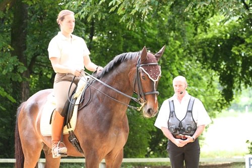 Nejdříve koně „opracovali“ na dvou stopách; dovnitř plec, poloviční překroky v kroku. Pro oživení pohybu bylo potřeba provést pár přechodů krok – zastavení – klus. Pak projeli stejnou práci na dvou stopách v klusu, prokládali ji lehkým klusem na velkém kruhu s vytažením krku. I tento kůň předváděl pod Isabellou nevýrazné, těžkopádné překroky v klusu.