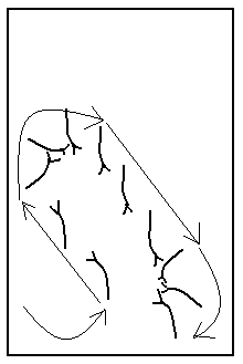2. ale chtít větší odstup od stěny (lze použít otěže stylem „neck reining“ a jimi vytlačit předek doprava a přitom dobře sedět na levé sedací kosti, abychom udržel směr pohybu vlevo podél stěny).