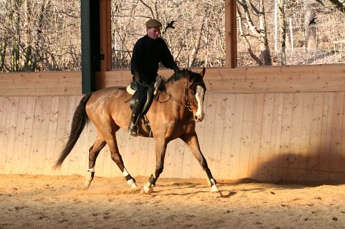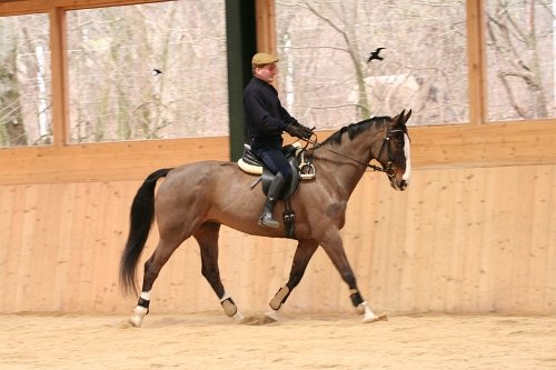 Angloarab se ještě během únorového kurzu srovnal v pohybu, chodil už plynuleji a nebyl už tak „rozpojený“, protože se uvolnil a zlepšila se jeho rovnováha. Začali tedy pracovat na tom, aby si sám na signál protáhl krk = sám napínal otěže. Protože má citlivou hubu, je třeba s ním provádět opatrnou akci-reakci (viz díly o Franzovi a Martinovi). Nejdříve to zkoušejí v kroku, pak v lehkém klusu. Zvednout ruce > udidlo do koutků > nastolit tím lehký kontakt s živou hubou > poté ruce lehce povolit, ale kontakt nezahodit > jít rukama velmi opatrně dopředu a dolů > kůň by je měl následovat > pokud se lehký kontakt ztratí (zde kůň uteče za kolmici) > opět zvednout ruce a vše opakovat. Kůň se bude časem natahovat stále ochotněji a hlouběji.