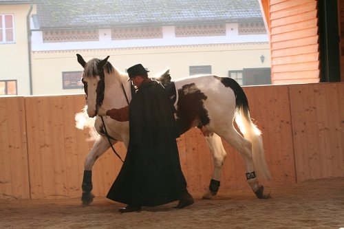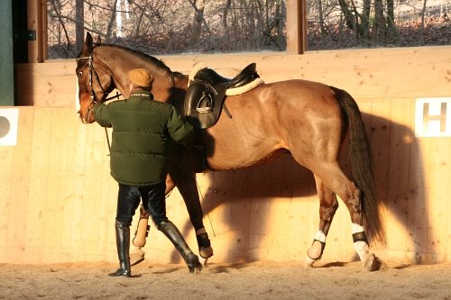 1. Dvojice jde podél stěny a vodič učí koně, aby se soustředil na něho (dopředu, zastavit, zacouvat atd.). Pro rozejití se musí nejdřív rozejít vodič. Pokud ho kůň sám nenásleduje, tušírkou se dotkne jeho levého boku za podbřišníkem. Je třeba udržovat krk koně rovný, v případě potřeby ho zatlačit levou rukou ke stěně a napnout vnější otěž. Pro zastavení lehce zvednout levou ruku, pro couvání působit tahem udidla do koutků. Vodič musí sledovat celé tělo koně, nejen jeho hlavu. Pokud chce dosáhnout vyklenutého týlu, napne vnější otěž a vnitřní kroužek udidla vytáhne do koutku huby.