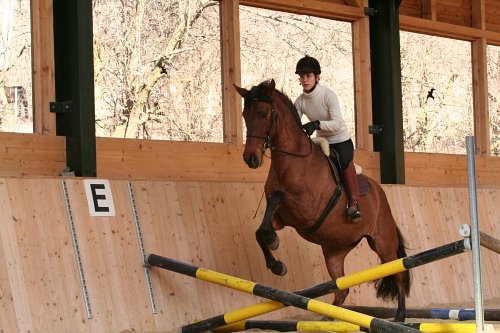 Obr. 12: Isabellin hnědák je bývalý parkurový kůň a s takovou řadou nemá nejmenší problém.Po novém roce se má na Marienhofu konat další čtyřdenní kurz a já pomalu začnu procvičovat svoji pravačku, aby zvládla pořizovat poznámky aspoň v dosavadním rozsahu.