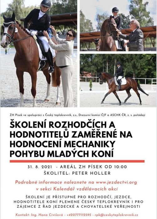 Toto školení, které je určené nejen pro rozhodčí a hodnotitele, ale i pro širokou diváckou veřejnost a zájemce z řad jezdců, proběhne dne 31. 8. 2021 od 10:00 v ZH Písek.
