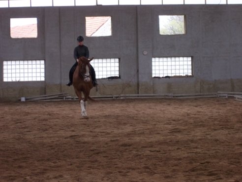 Bohužel se mi nepodařilo zachytit tuto zajímavou dvojici v tréninku, nicméně jezdkyně je i po lekci očividně nadšená. Klusová gymnastika (přidat, zkrátit, zkrátit ještě a pasáž a zase ven) pomůže Rockymu zvýraznit chody – nezrychluj, kontracval zlepší kvalitu cvalu, nezapomínej ho doma dělat. Piafa je lepší než pasáž, zkus vyvinout pasáž z ní. Denisův nejoblíbenější český plnokrevník 🙂