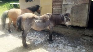 Babetka je pořád venku v hliněném výběhu s přístřeškem, do kterého mají všichni poníci volný přístup. „Pastviny“ mám k dispozici díky hodným sousedům v podobě neužívaných zahrad kolem. Trávy v nich si bohužel Babetka už pár let neužije, protože dle veterinářky nemá dost stoliček – asi před 5 lety si ucpala jícen a od té doby krmím pouze rozmočenými sennými granulemi + müsli Spillers Senior. Dříve jsem krmila 3x denně, ale postupem času se ukázalo praktičtější ji na den oddělit od ostatních páskou a nechat jí dávku na celý den k dispozici celou, ať si průběžně užírá. Díky tomu je zase krásně kulatá. Zhruba ve stejné době prodělala pravděpodobně mrtvičku a její stav šel dost dolů, naštěstí to ustála.