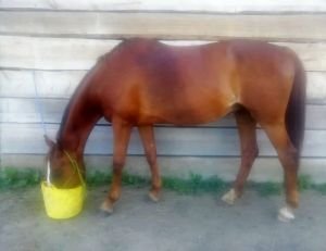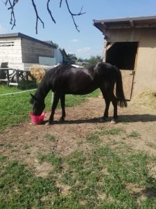 Zdravotní stav – kupovaná na jedno oko slepá, cca od 35 let se jí zhoršil zrak i v dříve zdravém oku, už i hůř slyší. Zuby má již špatné, pastvu zvládá, ale seno musí mít granulované. Jako příkrm dostává mačkaný oves, otruby, máčené vojtěškové granule a řepné řízky. K tomu na ochucení přidávám müsli – buď na přibrání od Koňské bylinky, nebo NovaEqui nebo Hippi Naturvit. Vždy to, co obsahuje pivovarské kvasnice a jablečné úsušky, někdy šípek. Do toho ostropestřecový olej a Artroregen sirup od Topvetu. Kyblík dostává ráno a večer, ale jak má horší zuby, stejně ten kýbl žmoulá víc jak hodinu – takže samozřejmě nemůže žrát se stádem, ale v klidu v soukromí.