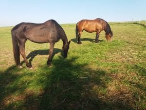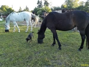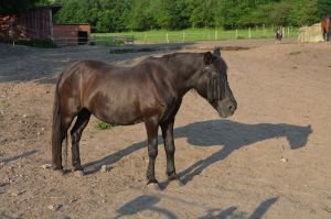 Zuby už má dost zbroušené, ale ještě trávu i jemné seno zvládá. Příkrmy dáváme máčené (před 3 lety si ucpala jícen) – 2 litry řezanky a 1,5 l hobby granulí od ADW, slunečnicový olej, len a Topvet na klouby (preventivně). Jinak je zdravá a většinou na procházkách dost čilá, ale někdy už dá najevo, že nechce pohyb navíc. Ustájená je boxově, momentálně ve vedrech přes noc venku a přes den v boxe, přes zimu naopak.
