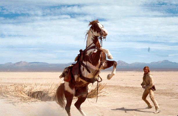Scéna zajímavě vypadala, ale průběh natáčení nebyl tak mírumilovný, jak vyobrazil film. Kůň použitý ve scéně totiž při pádu zahynul a jeho fatální konec se i předpokládal. V této akční scéně byla využita sklopná plošina, tzv. „sklopná bouda“, která donutila koně z útesu sklouznout proti jeho vůli. V klíčovém okamžiku se tedy deska, na níž kůň vstoupil, sklopila, kůň z útesu spadl a následkem pádu uhynul. Další scéna filmu ale ukazuje Fondu a jiného koně, jak společně odplouvají řekou do bezpečí.