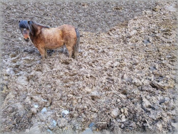 Upršený den na dvou rozdílných stanovištích. Rozbahněná holá ohrada a pečlivě zpevněný základní výběh. Na obojí navazují pastviny (zpřístupňované pouze na část dne). Přesto jsou na místo č. 1 často podávány podněty KVS k přešetření welfare umístěných zvířat, na rozdíl od místa č. 2. Asi se nedivíte, že…?