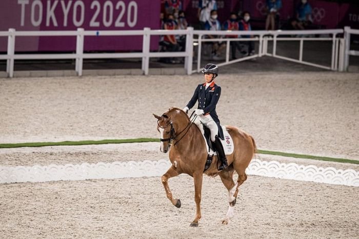 Gio v sedle s Charlotte Dujardinovou z britského drezurního týmu předvádí piafu na olympijských hrách 2020 v Tokiu. Se svolením FEI.