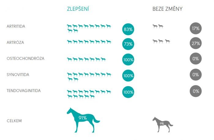 Po měsíčním podávání kyseliny hyaluronové došlo ke zlepšení u 85 % koní. Po 30 dnech od ukončení studie došlo ke zlepšení o dalších 6 %. Celkové zlepšení bylo tedy zaznamenáno u 91 % koní. Ze studie tedy vyplývá, že minimální množství 150 mg kyseliny hyaluronové je účinné proti všem typům kloubních problémů. Ve studii bylo dále zjištěno, že účinná látka tlumila zánětlivé příznaky i v silně iritovaném kloubu. Její užívání vedlo k ústupu náplně kloubu, zlepšení projevů kulhání a ústupu bolestivosti.