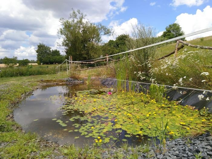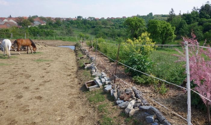 Základní výběh oddělený od pastvin keřovou výsadbou, která časem vytvoří větrolam. Dole ve spádu záchytný svejl, využívaný v suchu k zalévání.