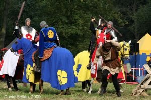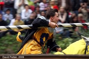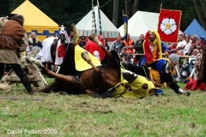 Rytíři, synové pana Vítka, předvedli svou obratnost při plnění všech úkolů, které jim určil pan Vítek. Pak už se zdálo, že znaky své si zaslouží, ale to by nebylo vše, kdyby nedošlo na kopí. Sám Dietrich z Dietrichštejna (Pavel Vokoun), erbu černé růže, vyzval všechny syny, aby se s ním utkali na koni buď s mečem či s kopím. Došlo tak k nelítostnému boji, kdy například Martin Povr alias syn pana Vítka, rytíř s modrou růží ve žlutém poli, nepěkně upadl. Odbelhal se do zákulisí a až tam jsme se dozvěděli, že je to jezdec džigitovky a podobné kaskadérské kousky jsou prostě naschvál. Jeho pád vypadal opravdu živě, až bych litovala diváky nejen v první řadě. Ale v kulhání bylo poznat, že to byla jen skvělá imitace. Opravdu povedený kousek, který si svůj potlesk zasloužil.