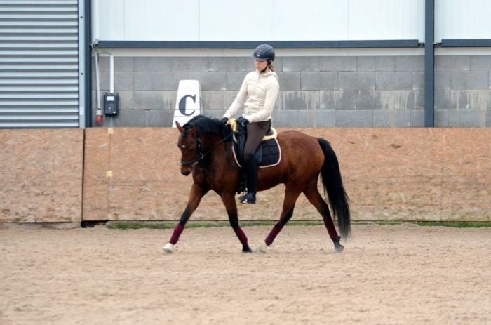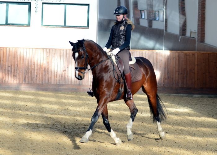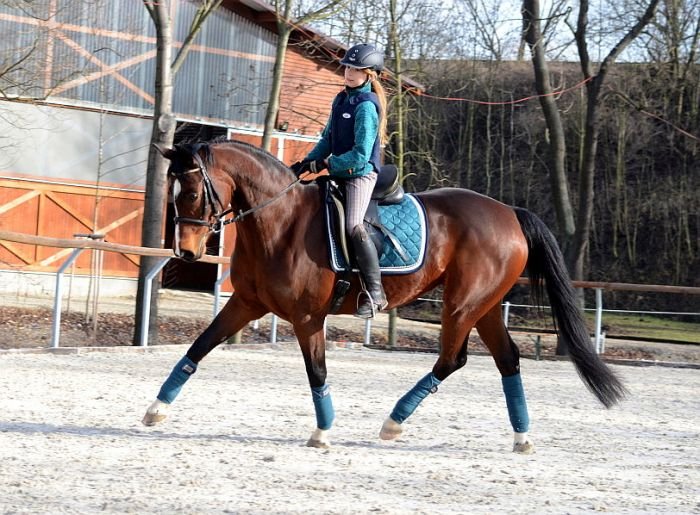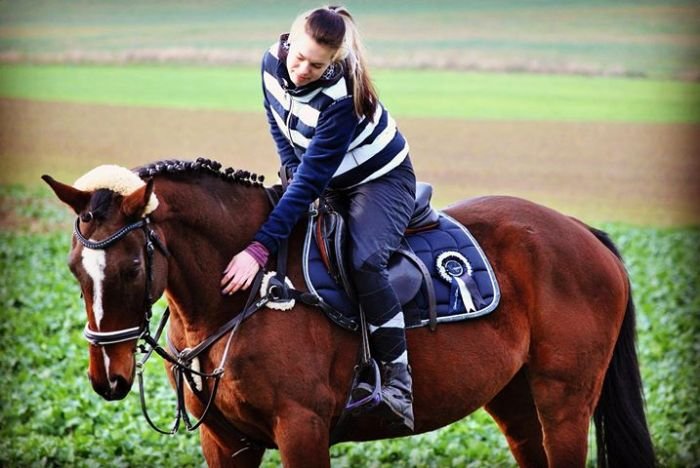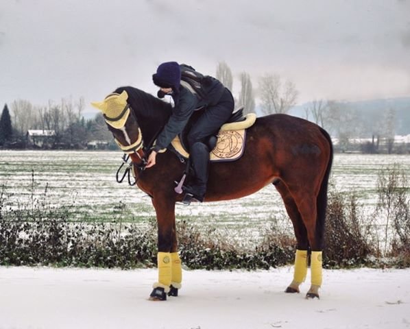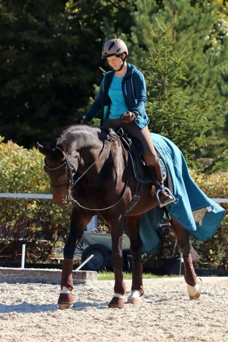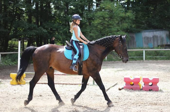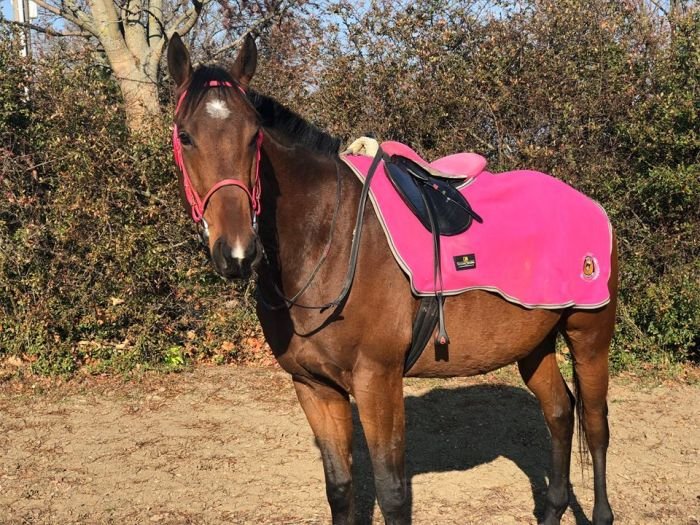 A překvapivě pěkně na středně hnědém koni vypadá i tmavomodrá, zejména pokud je něčím oživená – třeba „trestaneckými“ pruhy.