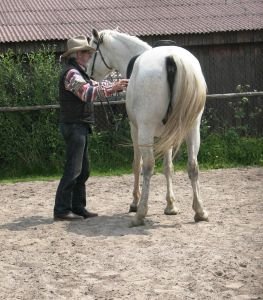 Okrem spoločných cvikov na podsadzovanie a ohýbanie koňa dr. Hollý riešil konkrétny problém spomínaných dvoch koní s nacválaním na správnu nohu. Ešte pred tým sa však riešil problém „nestátia" lipicána pri nasadaní. Jeho vyriešenie trvalo niekoľko minút, stačilo, aby jazdkyňa opakovane zosadala a nasadala (z oboch strán). Lipicán veľmi rýchlo pochopil, že to nie je bohvieaká zábava a o rozhodol sa, že stáť pri nasadaní je pre neho výhodné.