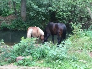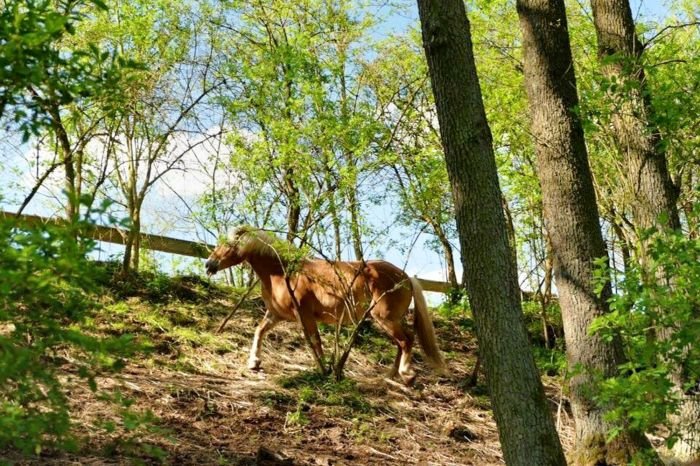 Po prostředním treku mohou dojít do malého lesíka v kopečku, ze kterého pak prochází do horního přístřešku, kde je rozšířený prostor a „drbací stromy“. Navazuje rozcestí, kde je možnost vydat se vrchním trekem a směřovat do velkého lesa. A nebo spodním, který vede do cesty kolem stromů a do kruhovky plné písku, kde se koně rádi válí a občas na slunku pospí. Trekem vyběhnou nahoru na kopec a zde si zvolí, zda se vydají na horní trek, nebo na opačnou stranu do lesa, kde mají zase další možnost se vyválet v písku. Potom jdou hledat kupky sena do lesa, který je částečně ve strmém kopci, takže koně denně „nenápadně“ posilují svá těla. Kupky sena jsou rozmístěné tak, aby stádo motivovaly proplétat se mezi keři bezu a šlapat do kopce.