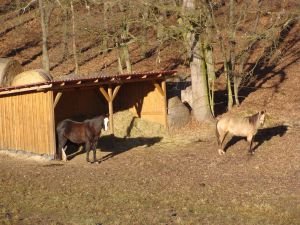 Na obou pastvinách je k dispozici dřevěný přístřešek chráněný ze tří stran, na zimní pastvině o velikosti "pouze" 3,5 x 6 m, na letní pastvině 3,5 x 9 m plus volně otevřený dřevěný box 3,5 x 3 m. Tedy krytého suchého závětří mají koně opravdu na výběr dost a dost.