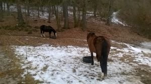 Protože zde mám koně v nájmu, samotné pastevko nevlastním, tak mám práci pouze s běžným úklidem v přístřešku a kolem krmiště. To v zimě zabere na pět koní cca hodinu, přesto ve všední dny, jakožto zaměstnaná osoba s normální délkou pracovní doby, jezdit určitě nestíhám (zatracený zimní čas, kdy je tma už skoro ve čtyři!). Jezdím pouze o víkendech. Jakmile se čas změní na letní, nastane aktivnější období, to už je času díky délce dne najednou trochu více a aspoň krátká vyjížďka bez sedla se v březnu dá absolvovat i v pracovních dnech.